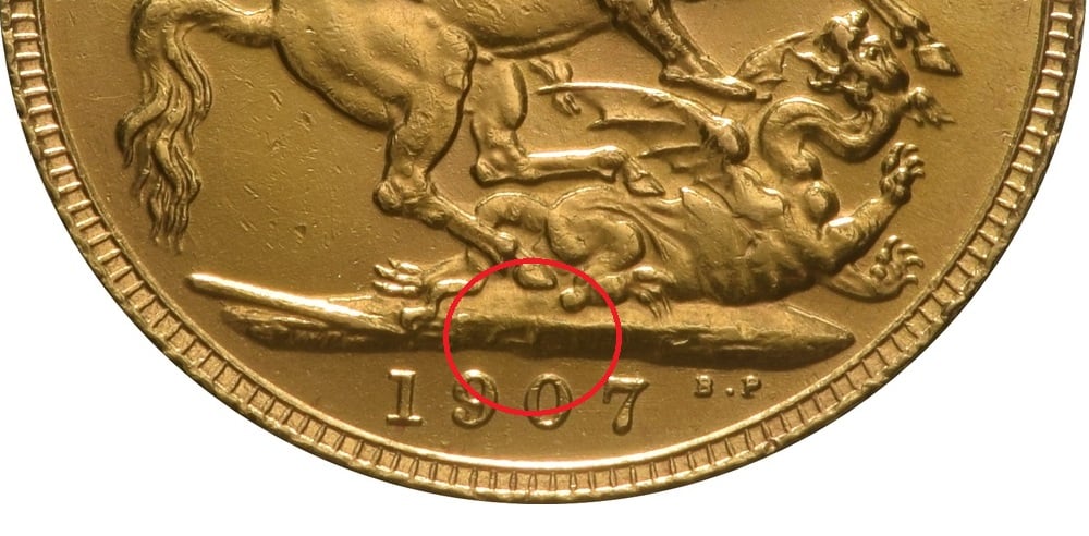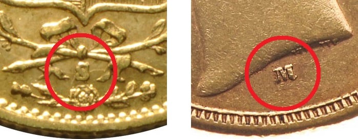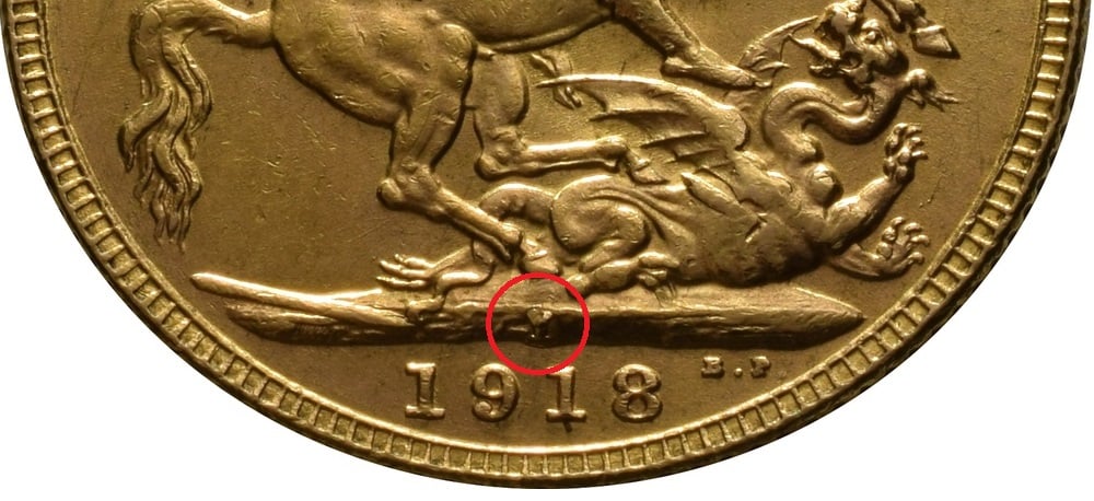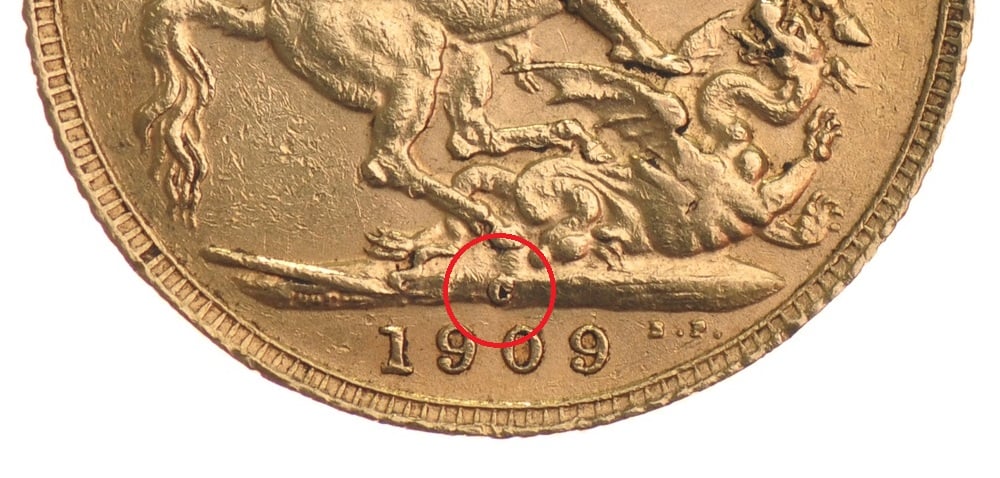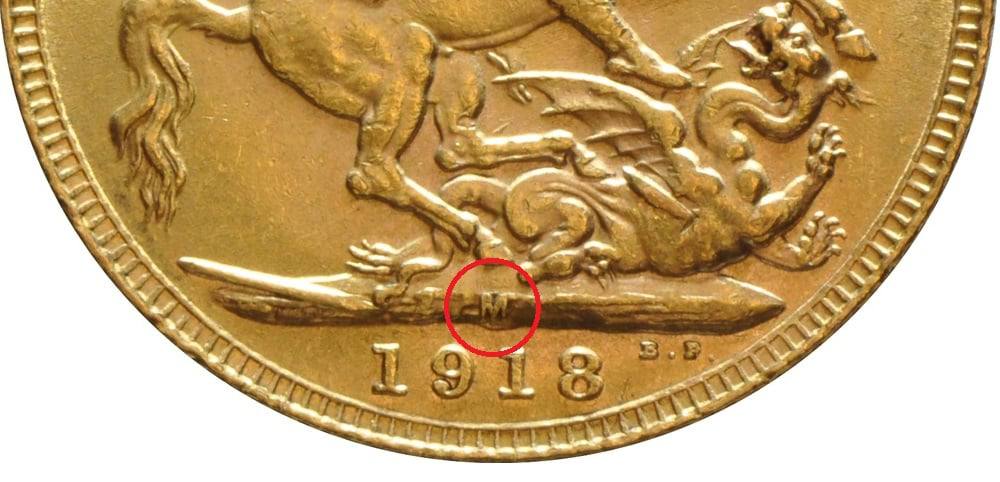 Чтобы отличать золотые суверены, чеканившиеся на разных монетных дворах Британской империи, на часть выпусков наносили небольшие буквы - обозначения монетного двора. Как правило, знак располагается над датой, на площадке под изображением святого Георгия и дракона.