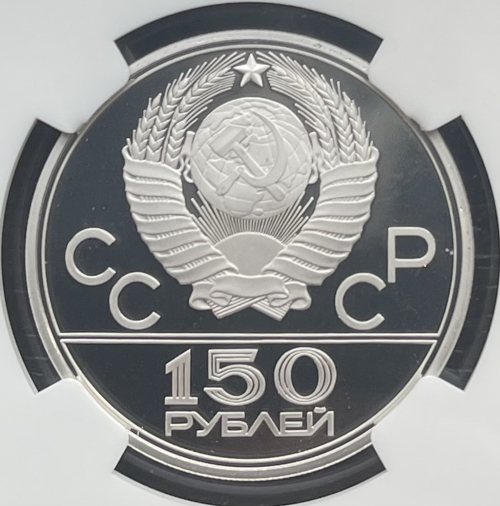 Сверху герб СССР с 15 витками ленты, слева от него буквы «СС», справа «СР», ниже двойная черта, под ней обозначение достоинства монеты цифра «150» и ниже слово «РУБЛЕЙ».