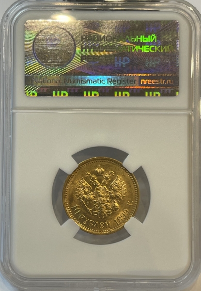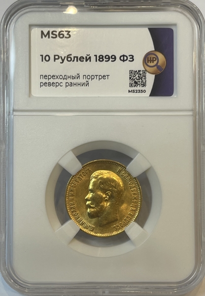 Золотая монета 10 рублей Николай II 1899г.,ФЗ, в слабе ННР MS 63