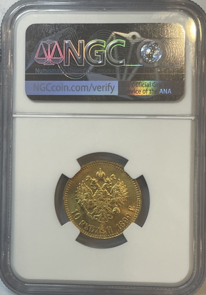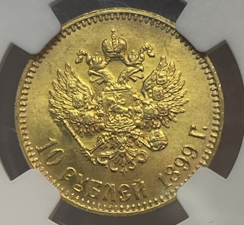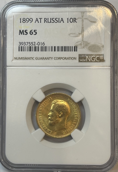 Золотая монета 10 рублей Николай II 1899г.,АГ, в слабе NGC MS 65