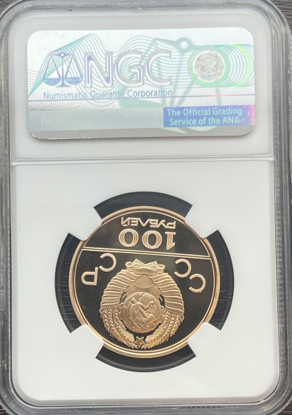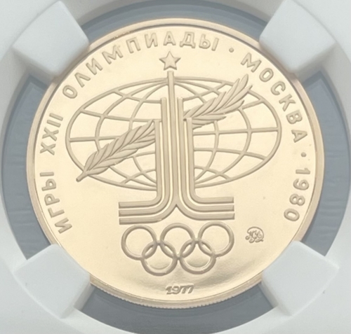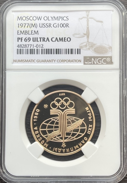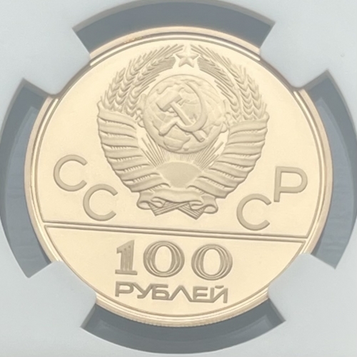 Золотая монета 100 рублей "Аллегория Спорт и Мир" (Эмблема Олимпийских игр 1980г)1977г.ММД в слабе NGC PROOF 69 ULTRA CAMEO