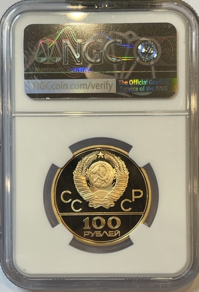 Сверху герб СССР с 15 витками ленты, слева от него буквы «СС», справа «СР», ниже двойная черта, под ней обозначение достоинства монеты цифра «100» и ниже слово «РУБЛЕЙ».