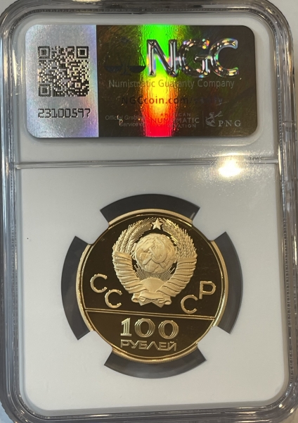Сверху герб СССР с 15 витками ленты, слева от него буквы «СС», справа «СР», ниже двойная черта, под ней обозначение достоинства монеты цифра «100» и ниже слово «РУБЛЕЙ».