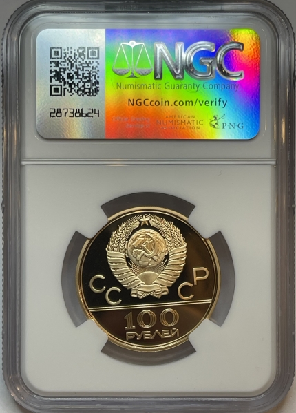 Сверху герб СССР с 15 витками ленты, слева от него буквы «СС», справа «СР», ниже двойная черта, под ней обозначение достоинства монеты цифра «100» и ниже слово «РУБЛЕЙ».