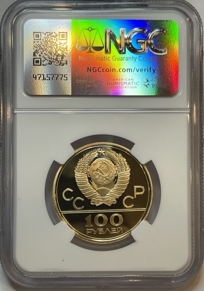 Сверху герб СССР с 15 витками ленты, слева от него буквы «СС», справа «СР», ниже двойная черта, под ней обозначение достоинства монеты цифра «100» и ниже слово «РУБЛЕЙ».