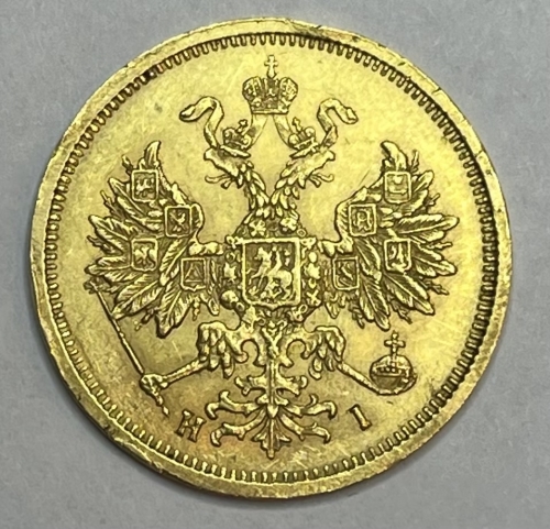 В центре указан номинал «5», ограниченный с обеих сторон шестиконечными звездочками. Под цифрой номинала — слово "РУБЛЕЙ". Ниже, расположен декоративный разделитель в виде двух разнонаправленных фигурных линий и небольшой выпуклой точки между ними. Под разделителем — дата выпуска монеты «1877». Под цифрой даты — обозначение монетного двора «С.П.Б.». Центральная часть отделена от остального изображения, окружностью в виде точек. За окружностью круговая надпись: «ЧИСТОГО ЗОЛОТА 1 ЗОЛОТНИК 39 ДОЛЕЙ», разделенная сверху цветочной розеткой. По окружности канта имеются рельефные элементы, выполненные в виде зубцов.