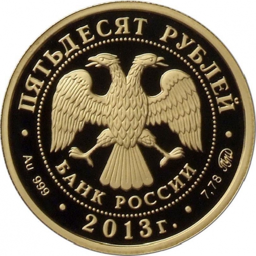 в центре — эмблема Банка России (двуглавый орёл с опущенными крыльями, под ним — надпись полукругом «БАНК РОССИИ»), обрамленная кругом из точек и надписями по кругу — вверху: «ПЯТЬДЕСЯТ РУБЛЕЙ», внизу: слева — обозначения драгоценного металла и пробы сплава, в центре — год выпуска «2013 г.», справа — содержание химически чистого металла и товарный знак монетного двора.