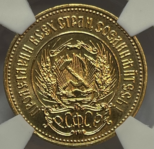 Герб РСФСР, окруженный венком из колосьев, и щит с изображением на нем серпа и молота на фоне солнечных лучей; по краю монеты точки вдоль них надписи: сверху - «ПРОЛЕТАРИИ ВСЕХ СТРАН, СОЕДИНЯЙТЕСЬ!», внизу под гербом - «Р. С. Ф. С. Р.».