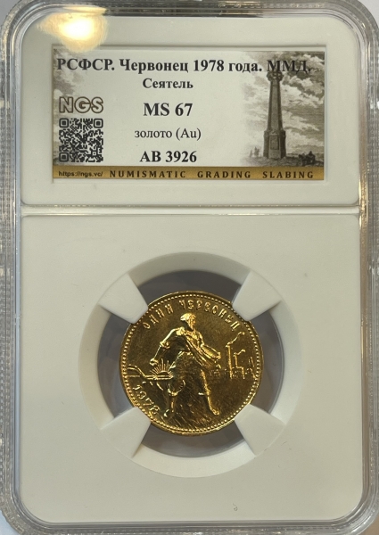 Изображение крестьянина-сеятеля на фоне плуга, восходящего солнца и заводов; по краю монеты точки, вверху надпись - «ОДИН ЧЕРВОНЕЦ», внизу слева — год выпуска - 1978.
