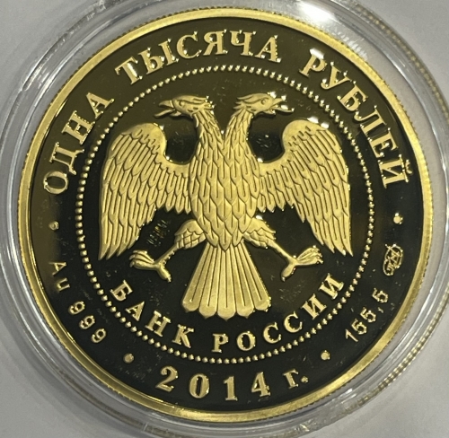 в центре – эмблема Банка России (двуглавый орёл с опущенными крыльями, под ним – надпись полукругом "БАНК РОССИИ"), обрамленная кругом из точек и надписями по кругу – вверху: "ОДНА ТЫСЯЧА РУБЛЕЙ", внизу: слева – обозначения драгоценного металла и пробы сплава, в центре – дата выпуска "2014 г.", справа – содержание химически чистого металла и товарный знак монетного двора.