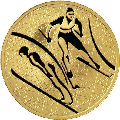 Реверс: на матовой поверхности диска - изображение двух спортсменов - бегущего по трассе и прыгающего с трамплина на фоне стилизованного изображения снежинок.