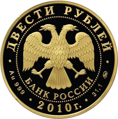 в центре - эмблема Банка России (двуглавый орёл с опущенными крыльями, под ним - надпись полукругом "БАНК РОССИИ"), обрамленная кругом из точек и надписями по кругу - вверху: "ДВЕСТИ РУБЛЕЙ", внизу: слева - обозначения драгоценного металла и пробы сплава, в центре - дата выпуска "2010 г.", справа - содержа-ние химически чистого металла и товарный знак монетного двора.